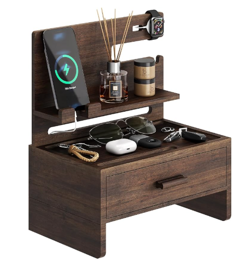 Great way to keep your stuff with more organized way.... This wooden nightstand organizer for Men/Women - stylish design & you can place in your bedroom, I can bet you, you will save some valuable time once you buy this product, you do not have to go up & down finding your car keys/wallet etc..